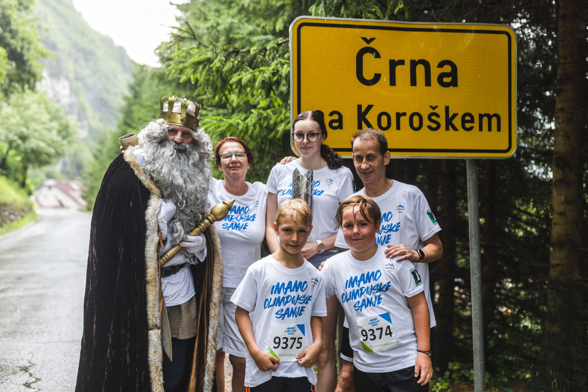 Kar dramatično pa je bilo ob obisku predzadnje občine na popotovanju slovenske bakle. Nad Črno na Koroškem, kjer kar mrgoli (zimskih) olimpijcev, se je sprva utrgal oblak, lilo je kot iz škafa, začetek gostovanja bakle pa je bil visoko na Navrškem vrhu nad Črno, kjer je štart najdaljšega zipline v Sloveniji – Olimpline. Nekdanji smučar Aleš Gorza je po jeklenici ponesel plamenico, v dolino pa so jo s postankom zaradi naliva pripeljali domači gorski kolesarji. Sledilo je nekaj predaj do stadiona NK Peca, med nosilci sta bila denimo tudi Danilo Pudgar, nekdanji smučarski skakalec in trener, ter priznana motivatorka Marjetka Čas. Zatem so občinski gostitelji bakli pripravili dolg sprejem s kulturnim programom na stadionu, tudi tu je deževalo kot iz škafa. A dež ni oviral prisotnih z jekleno voljo, med katerimi je bila tudi županja mag. Romana Lesjak, ki je s Pudgarjem v močnem dežju celo zaplesala. Obisk v Črni je baklina karavana zaključila s fotografiranjem pri tabli z imenom te najbolj športne slovenske vasi.